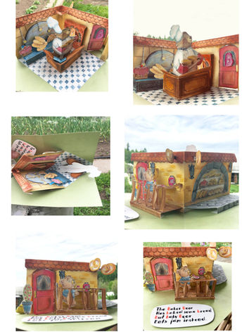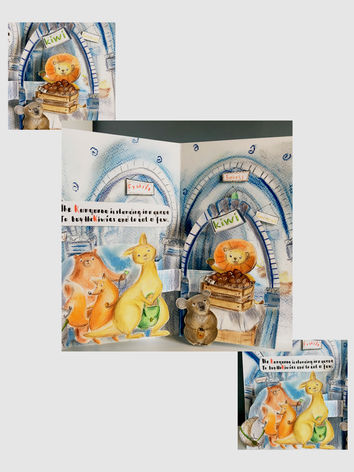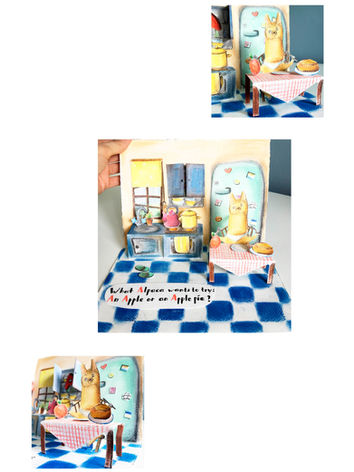 This book is my own project. It is a pop up book, including 25 spreads. Every spread includes an animal and a dish or a product beginning on one letter from the ABC. The materials used are pastels and paper, all details are scanned.